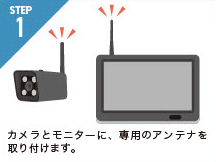 ●本製品の電波到達距離300mは、カメラとモニターの間に遮蔽物や電波妨害のない環境での距離を示します。 設置環境における遮蔽物の有無、天候や木の葉などによって到達距離が減衰します。 電波到達距離300mはあらゆる環境下での送受信を保証するものではありません。