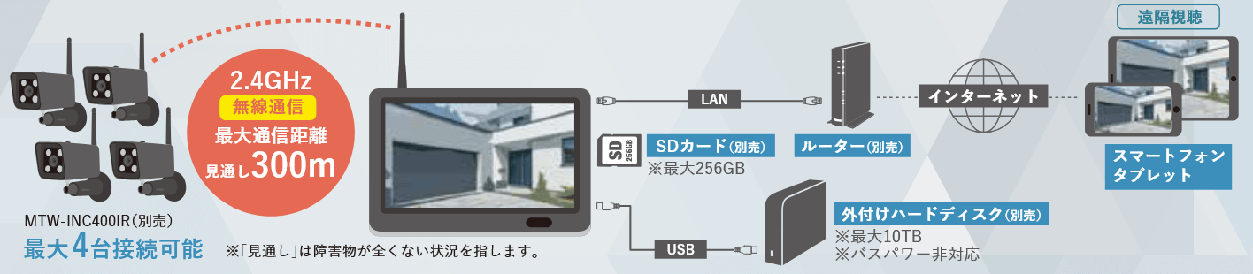 | 接続可能台数 | 最大4台 ※増設用カメラ別売 MTW-INC400IR |
